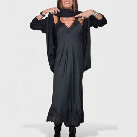 SABRINA™║Mono largo de terciopelo auténtico con escote en V y mangas largas de rejilla, elegante y retro