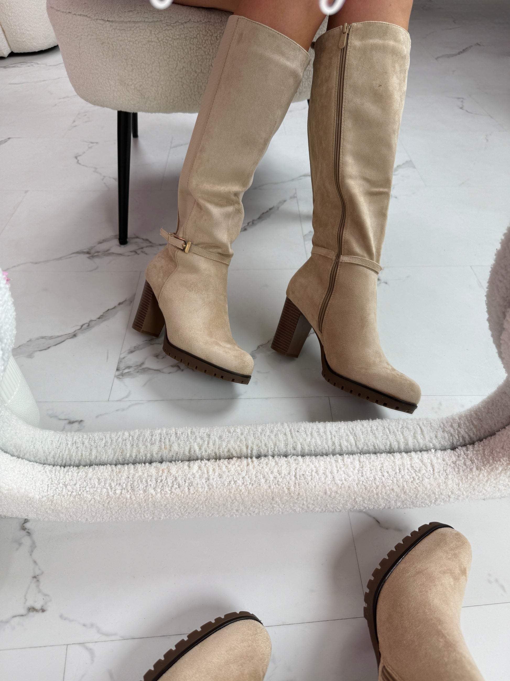 La versión en negro está confeccionada en piel sintética para un look elegante y moderno, mientras que la versión en beige está confeccionada en suave ante sintético para un look cálido y clásico. Gracias a su tacón grueso, estas botas ofrecen estabilidad y estilo.
